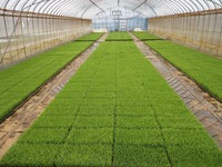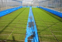 今月1日に種を播いてハウスに並べて白いマットを掛けて置き、3〜5センチ位伸びたらはぎます。