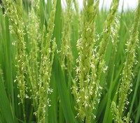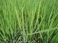 稲の穂が出て花が咲き始めました、コシヒカリです。