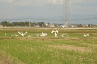 今年も沢山の白鳥が餌を求めて田んぼに遊びに来ています。写真を撮るために近付くと、今年は警戒心が強く、とうく離れていたのですが飛び立って行きまた。