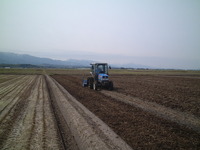冬から春にかけて乾いて硬くなった田んぼを、ロータリーという機械で耕していきます。これを当地では「田ぶち」と言い、田を打つという意味からきてると思います。田ぶちは今日終わりそうなので、次は代掻きに入ります。代掻きは、耕した田んぼに水をいれて土を泥状にする作業です。当組合では代掻き班と田植え班とに分かれて作業しますが、代掻き班がいつも田植え班に追いかけられて、代掻き班は終わるまで休み無しです・・・。