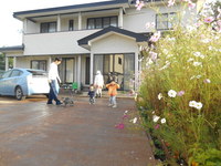 ハウス作りのたばこ(休息)の時間に、外でお茶を飲もうということになり、孫たちもさっそく出てきました。