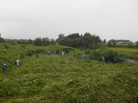 1年に一度、集落の皆が参加して、万願寺橋の上下流の堤防や広場の草刈を行います。たくさんの草刈機械のエンジンの音で話し声も聞こえなくなります。これで梅雨本番になっても、洪水の心配はなくなります。