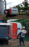コンバインの中の籾を排出して、コンテナに移し入れます。