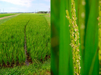 もっとも収穫が早い、早稲品種のもち米「わたぼうし」の田んぼで、穂が出揃いました。