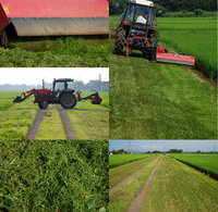 トラクタに装着した草刈り用の作業機、スライドモアで、広いあぜ道の雑草を刈っています。