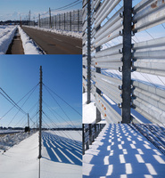 屋根の下にある、建物の壁やホースも、強い横風により、雪が吹き付けられています。