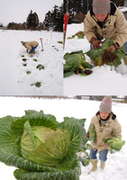 雪の下であま〜くなった、雪下かんらん(甘藍)は、外の葉を取って、地元の直売所へ納品します。