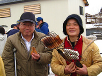 スルメやお餅などを持ち寄り、サイノカミの火であぶって焼き、食べることで無病息災を祈ります。