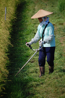 稲穂が垂れる田んぼのあぜで、草刈りをしています。