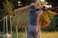 はさ掛けにしていた黒米をはさ木から下ろし、古いコンバインの脱穀部を使って、脱穀をします。