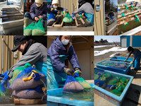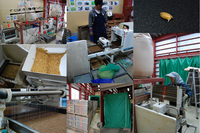 脱芒と選別作業が終わった種籾を、重さを量ってネット袋に入れ、小分けにしています。