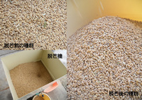 左上が脱芒前の種籾、左下が脱芒機、右の写真が脱芒後の種籾です。
