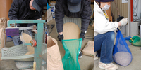 片口ショウケを使い、種籾をネット袋に入れて、ネット袋の口をしっかりと縛ります。