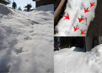 母屋前へ向かって、ヒマラヤスギの根元の雪に足跡が残っていました。