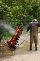 用水路の水をポンプで汲み上げ、高圧ジェットで噴射。除草機の泥汚れを落とします。