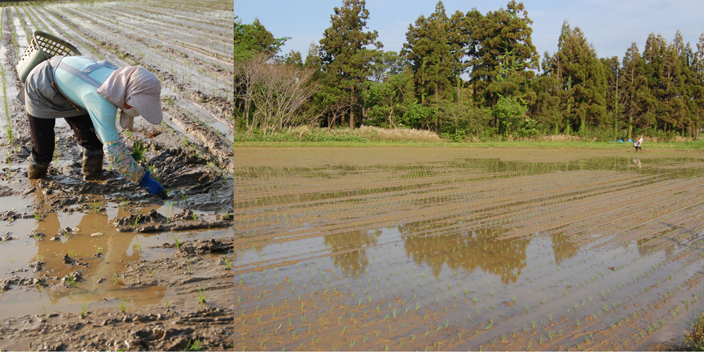 有機栽培米の田植えから一週間が経過。今年も竹ぼうき除草を行いました。