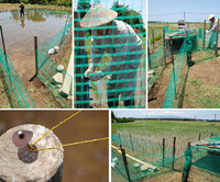 田んぼの周りに杭を立ててネットで囲い、脇に小屋を作ります。