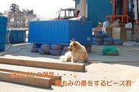 ぽかぽかの陽気・・・種もみを見張るピース君