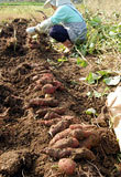 サツマイモのツルと生い茂る雑草を鎌で刈ってから、剣スコでグッと掘ってみると・・・芋の数は少なく、実も小さいし、どうやら少し早かったみたい?