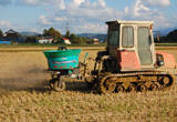 今週から、収穫後の田んぼに肥料を撒き、来年に向けて土作りを行なっています。