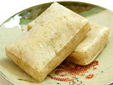 熱々のつきたて餅をのし棒でのし、乾かしてからカット、そして真空パック包装で完成!