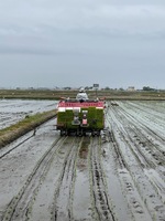 晴天の中、田植えが始まりました。お米専用ハウスで15?ほどに育ったコシヒカリの苗を植えました。このまま、順調に行けば5月下旬には田植えが終了します。