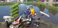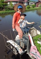 お母さんに田植え機に乗せてもらい、少しだけ田植え機の動かし方の練習です。