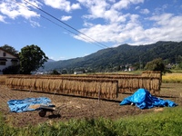 ハザ掛けを終えて雨除けのビニールをかけました。この時期ここ飯山は雨が多いので、手間になりますが乾きやすくします。でも朝は気温が低いので露が付きなかなか乾きません。
