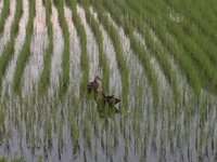 田植え後間もなく、カモらしき鳥がって来た。しばらく観察していると、頭を水の中に突っ込みなにかを食べているようだった。今年は近づいてもしばらく逃げないで田んぼの中を泳ぎまわっていて可愛いな。