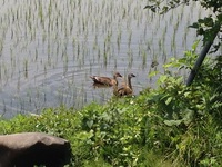 田植え後しばらくして2羽の鴨が田んぼに居着いていた。