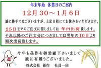 誠に勝手では御座いますが、当農場は記載の日程にて年末年始休業とさせて頂きます。