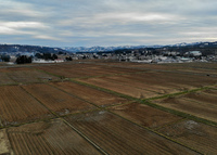 早春の田園散居村。めしゆたかファームの上空からドローンで撮影です。