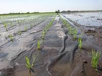 田んぼに紙を敷いて、雑草を抑える、紙マルチ田植です。