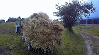 まずは、野菜や果樹のための敷ワラを畑に運びます。