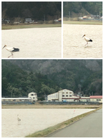 そんななかのたにの施設の手前の農道を通ると、冬にも水を張ってコウノトリえさを育てるコウノトリ育む田んぼで、コウノトリさんが食事中。ここでは、僕が通ると不思議と出会います。
