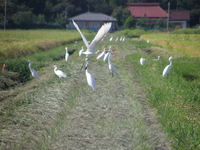涼しく成った、田んぼで草刈して居ると白鷺が十数羽カエルザリガニ他餌を食べに、来ています。