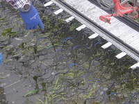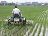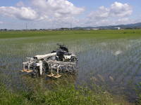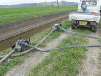 除草作業も後半に入り最後の除草機による作業です。中干しに入りポンプで水を汲みながら作業しています。