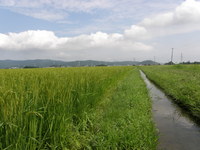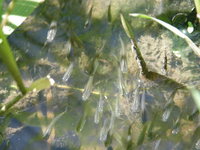 真夏の太陽一杯受けて、田んぼの中でメダカが泳いでいます。