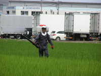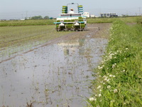 | 夢ごこちに穂肥(お米の栄養になる肥料)を撒いています。 |
