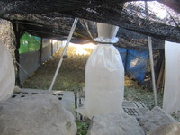 市販の眞砂土、籾殻薫炭、光合成菌ボカシをブレンドキャスタで攪拌し、ハウスの中に堆積して、約2か月掛けて熟成させます。