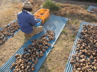 あとは、トタンの上で乾燥させ、ひげ根をとり、袋に入れて出荷します。