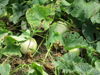 あら不思議!!さつまいもの葉の間からメロンが2本生えてきました。このまま無事成熟して!メロンを食べたい!
