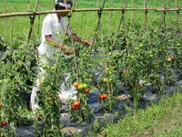 台風11号の接近に備えて畑のトマト、ピーマン、ナスが折れないように補強。
