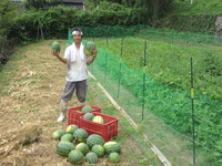 電柵の効果で今年は全く被害なく腹いっぱいスイカが食べられます。よく完熟していてとても甘くて美味しい!