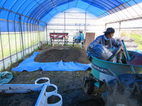 ビニールハウスにブルーシートを掛けた倉庫で培土作り。