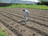 まず、光合成菌ボカシと貝化石を撒いて耕運・畝立てをします。次に種芋を並べて1人は穴を掘り、もう1人は芋を穴に入れ、次ぎの穴の土を被せる作業を700個分、延々と行います。忍耐と体力のいる作業です。