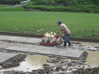 みのる式ポット苗のため、折衷苗代作りに、苗床の表面を均平にするため、周囲の溝切りのため、水を溜めるための畦塗りに、トラクター3台使用。縦横高さを計る殆んど土木工事。毎年大変な作業です。
