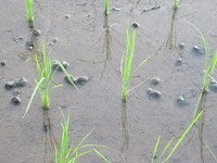 例年にない大雨で田圃の水が増えすぎ、調整ができないため全ての田圃の水を排水。田植えして2週間過ぎ、苗も育ってきて、ジャンボタニシの食害にも耐えられそうなので水を入れました。慣行栽培の圃場で排水が遅れ、苗が殆んど食害された田圃を今年はよく見かけます。