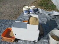 機械の中にモミや玄米が残るとネズミの害が発生するので、機械を回しながら、バケットに残った残米を取り除きます。丸一日掛かりました。