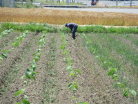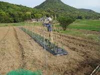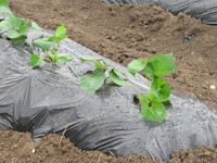 久しぶりに植えたメロンも根付いた様です。大根、人参を植えるためにマルチを張っています。